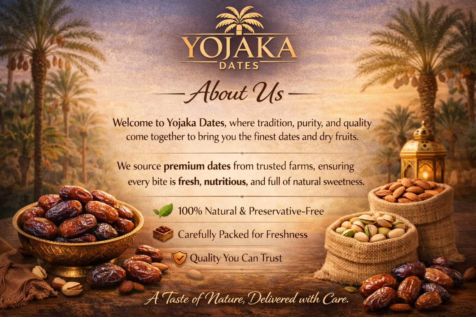 Welcome to Yojaka Dates, where tradition, purity, and quality come together to bring you the finest dates and dry fruits.